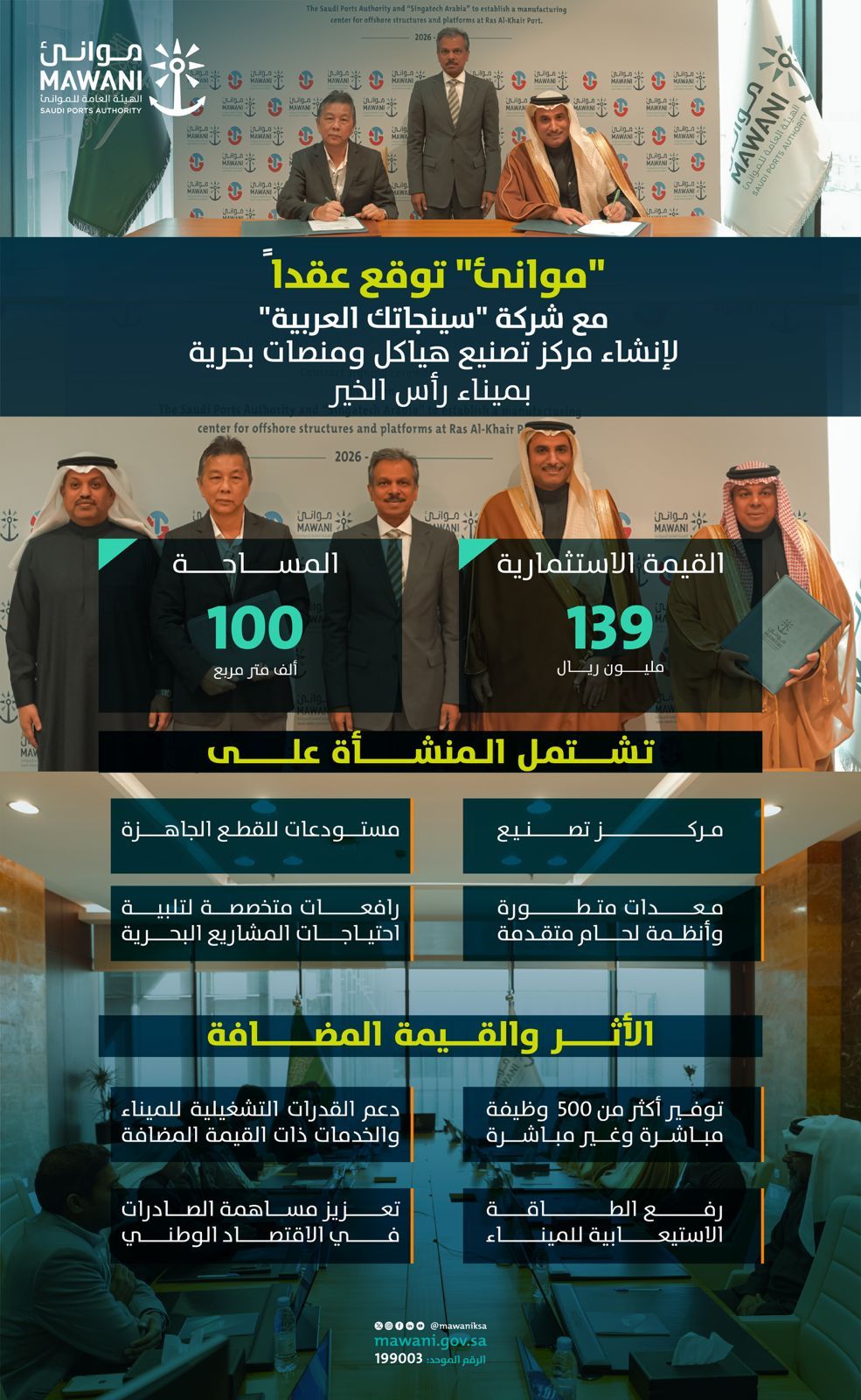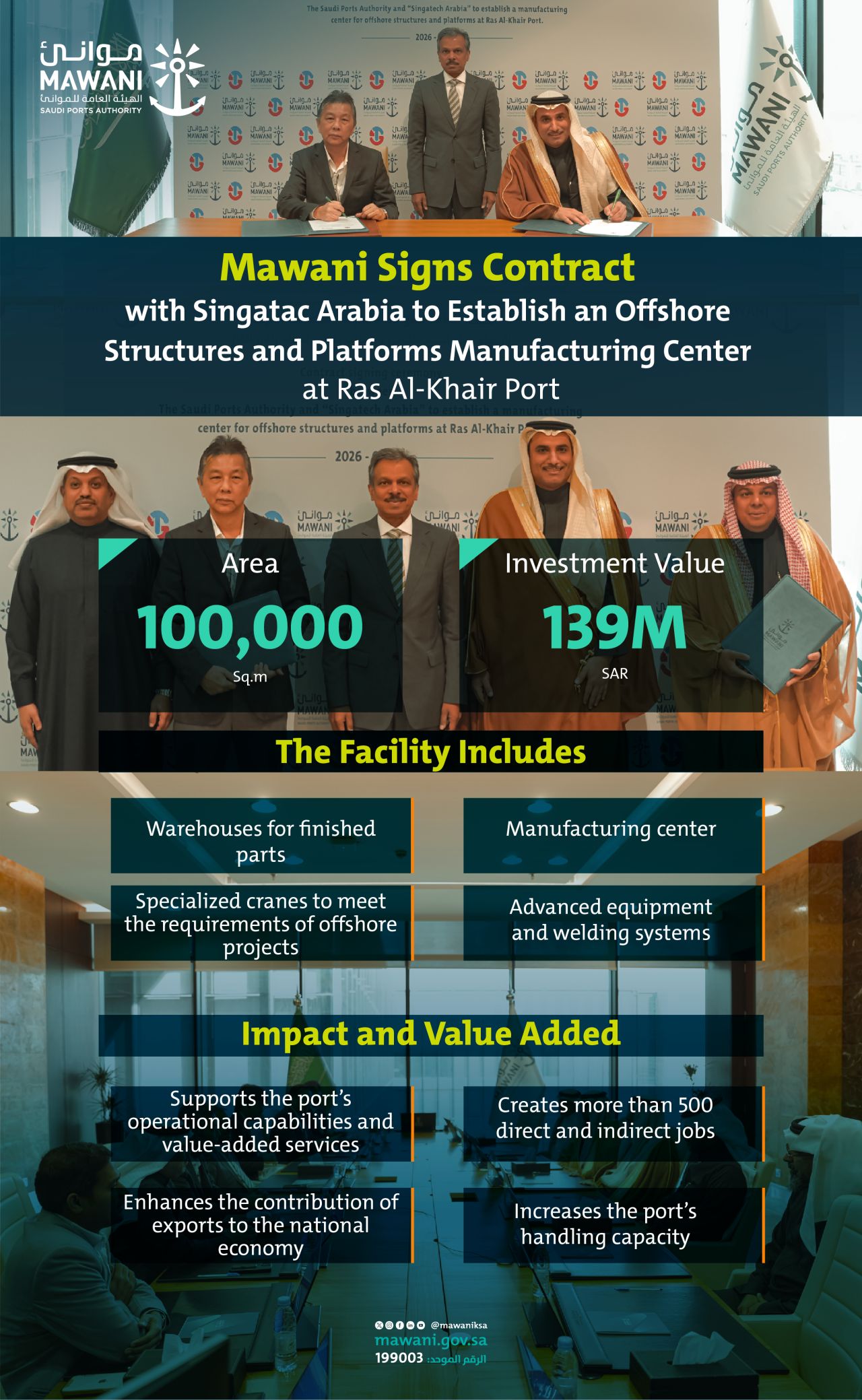 Singatac Arabia has entered into an agreement with the Saudi Ports Authority (Mawani) at Ras Al Khair Port to develop an offshore structures and platforms manufacturing centre, with a targeted investment of up to SAR 139 million.